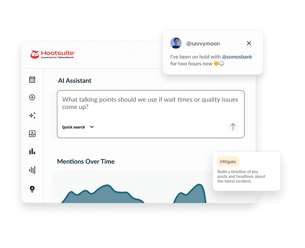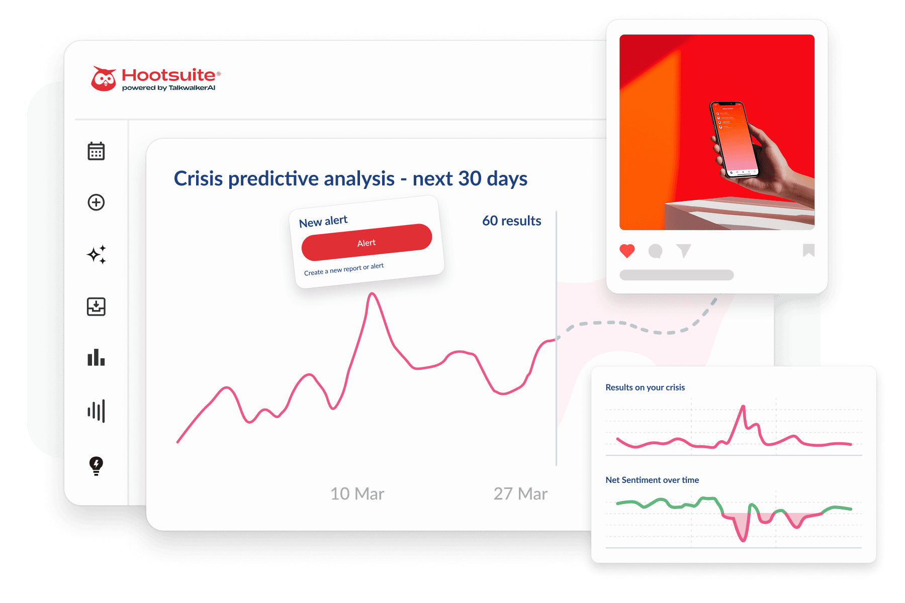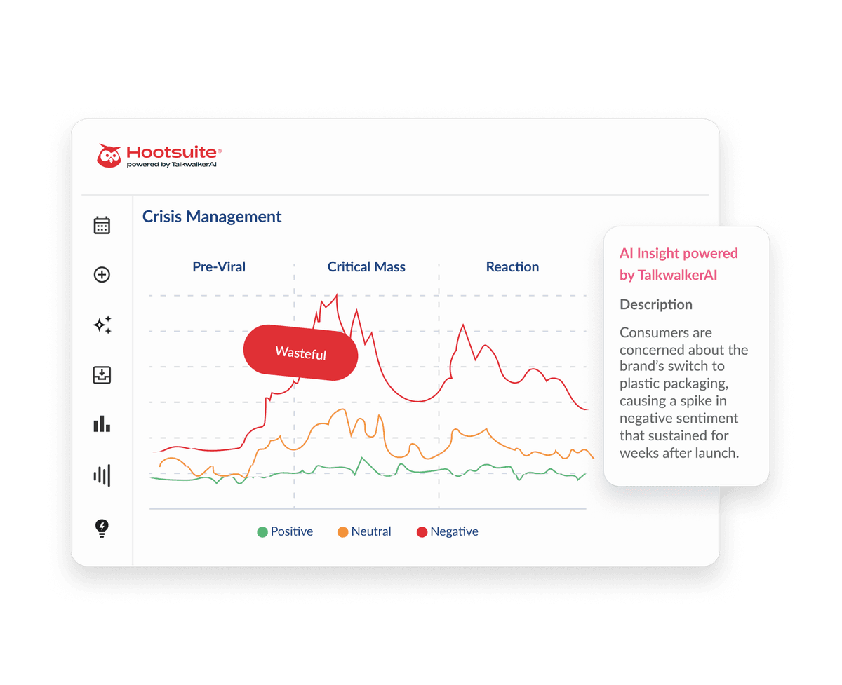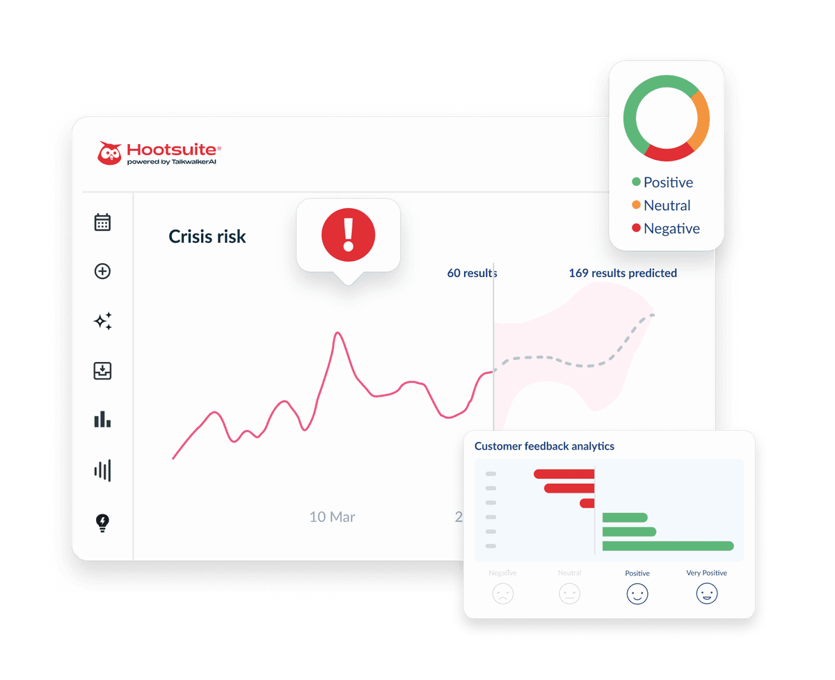 Monitoriza, responde y protege tu marca cuando más te importa con ayuda de Hootsuite, con la tecnologia de IA de Talkwalker. No te pierdas nada con el software de gestión de crisis impulsado por el mayor conjunto de datos del mundo.