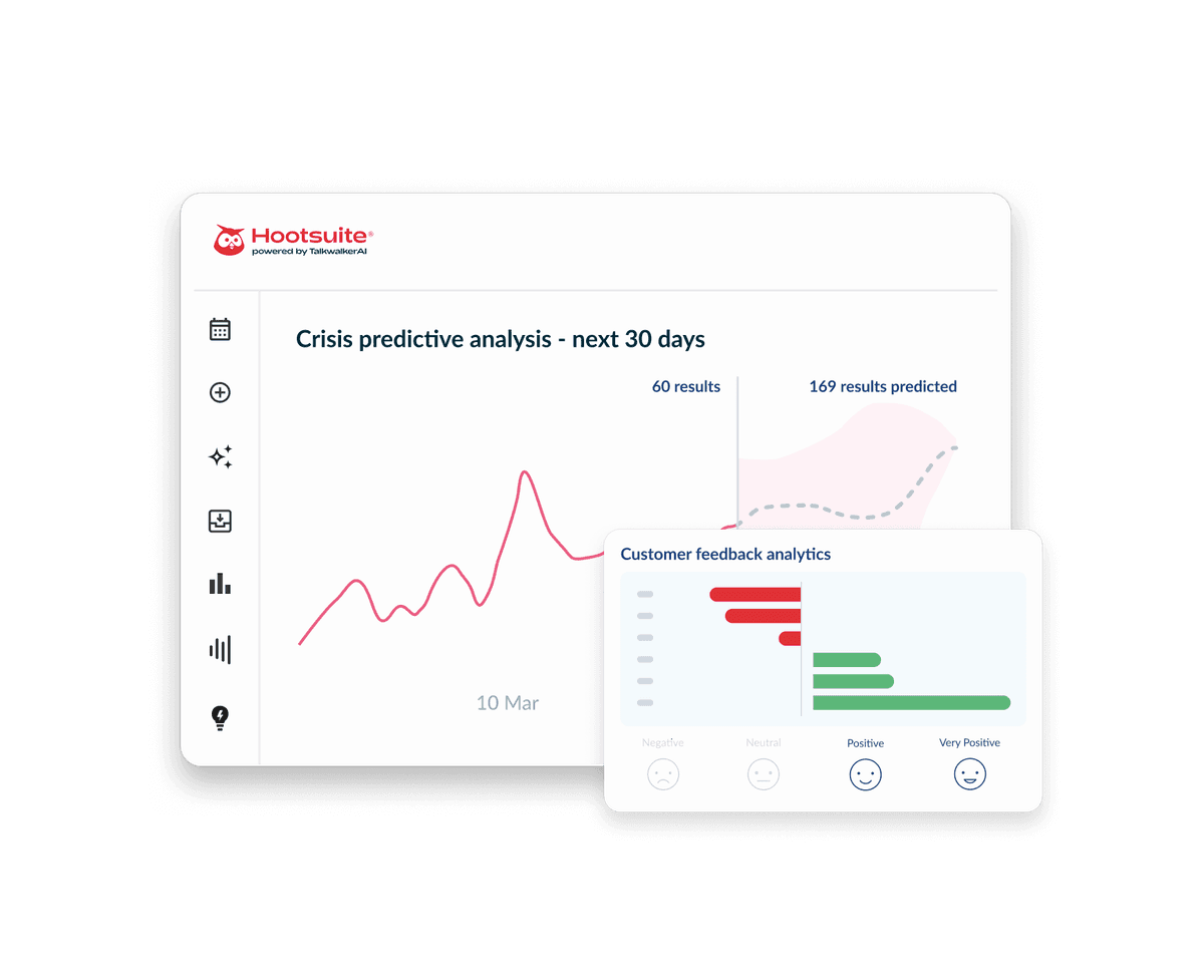 Hootsuite, con la tecnología de IA de Talkwalker, monitoriza la reputación de la marca rastreando en tiempo real millones de conversaciones por las redes sociales, noticias, blogs, foros y sitios de reseñas. La IA de Blue Silk™ analiza el sentimiento, detecta picos inusuales de actividad y resalta los riesgos emergentes antes de que se agraven. Con paneles de control unificados, una evaluación comparativa de la competencia y alertas automatizadas, obtienes una visión completa y siempre activa de cómo se percibe tu marca en todos los canales.