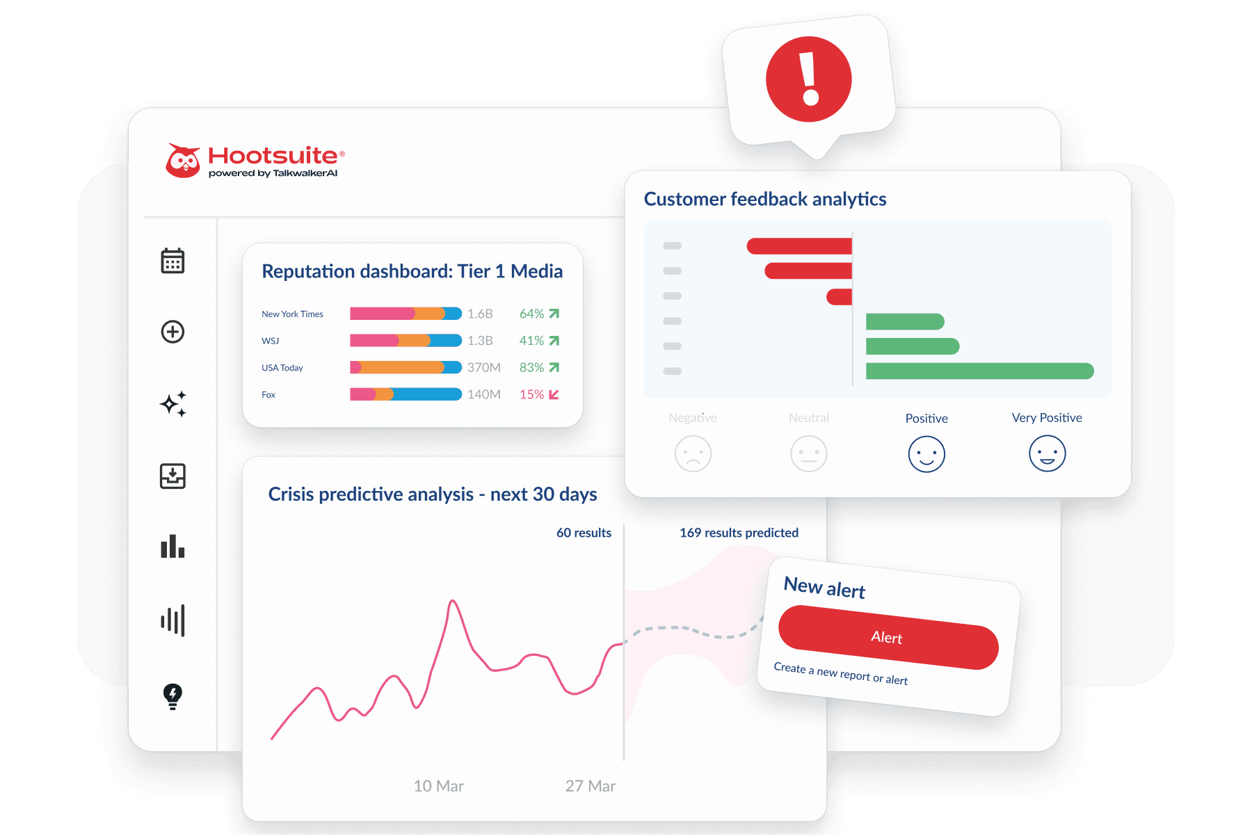 El mejor software de gestión de la reputación ofrece monitorización, análisis de sentimiento, detección de problemas e insights detallados de diferentes canales en tiempo real. Hootsuite, con la tecnologia de IA de Talkwalker, es considerada líder en este campo, gracias a que combina una cobertura de datos a nivel empresarial con una IA potente, lo que permite a las marcas detectar riesgos con prontitud, comparar el rendimiento y tomar decisiones fundamentadas. Mediante una monitorización exhaustiva de los medios, un análisis competitivo y unos informes flexibles, Talkwalker ofrece a los equipos todo lo que necesitan para proteger y reforzar su reputación.