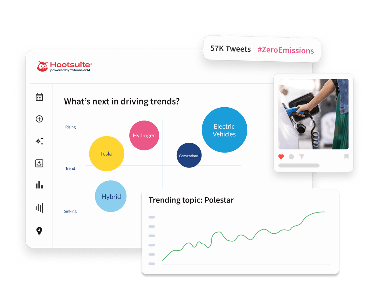 Spot emerging trends, predict what’s next, and activate insights across your strategy with Hootsuite powered by Talkwalker AI.