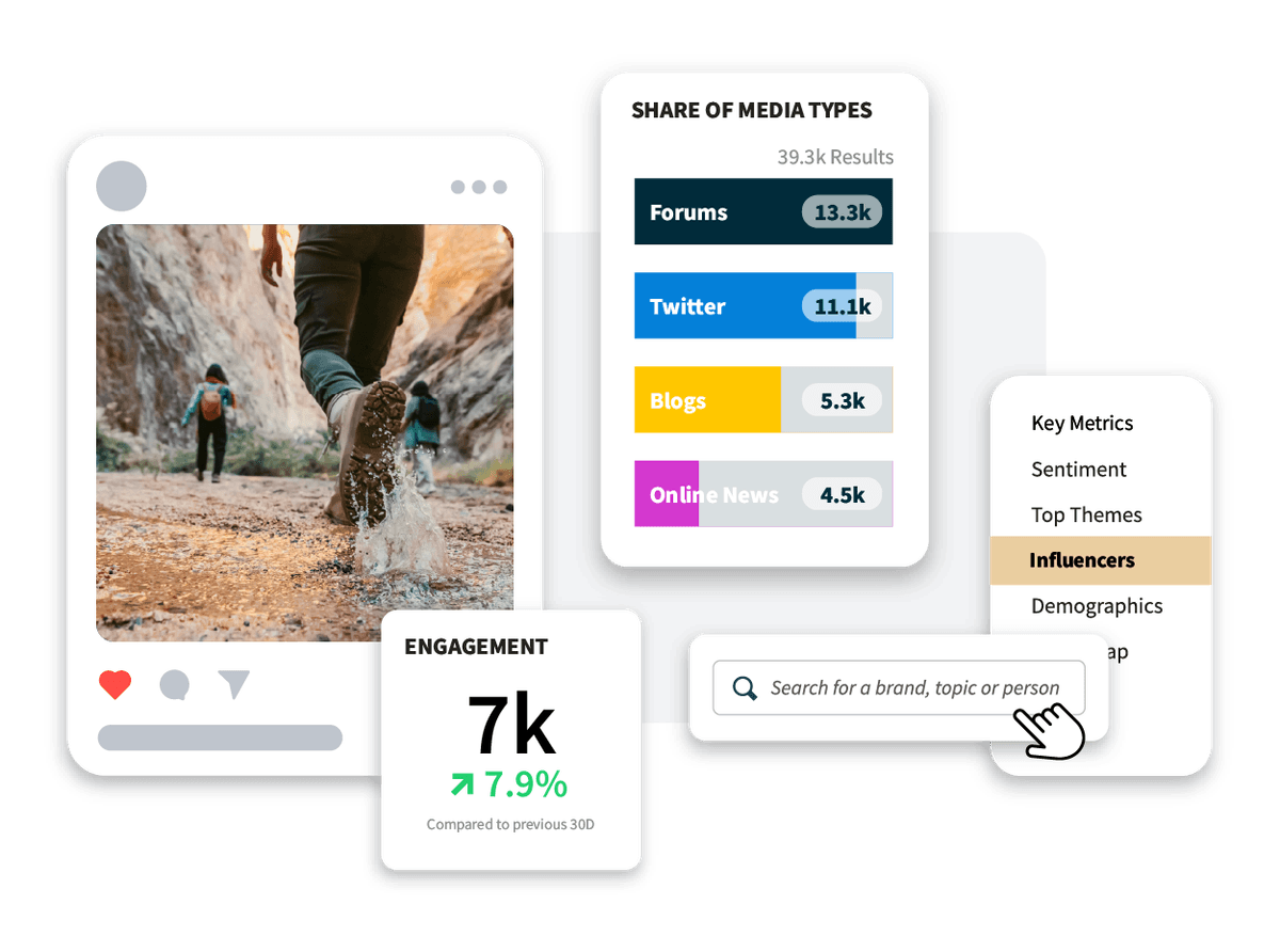 Busca menciones de marca y temas de tendencia en las redes sociales y la web. Mantente inspirado, obtén contenido generado por usuarios y mitiga los comentarios negativos.