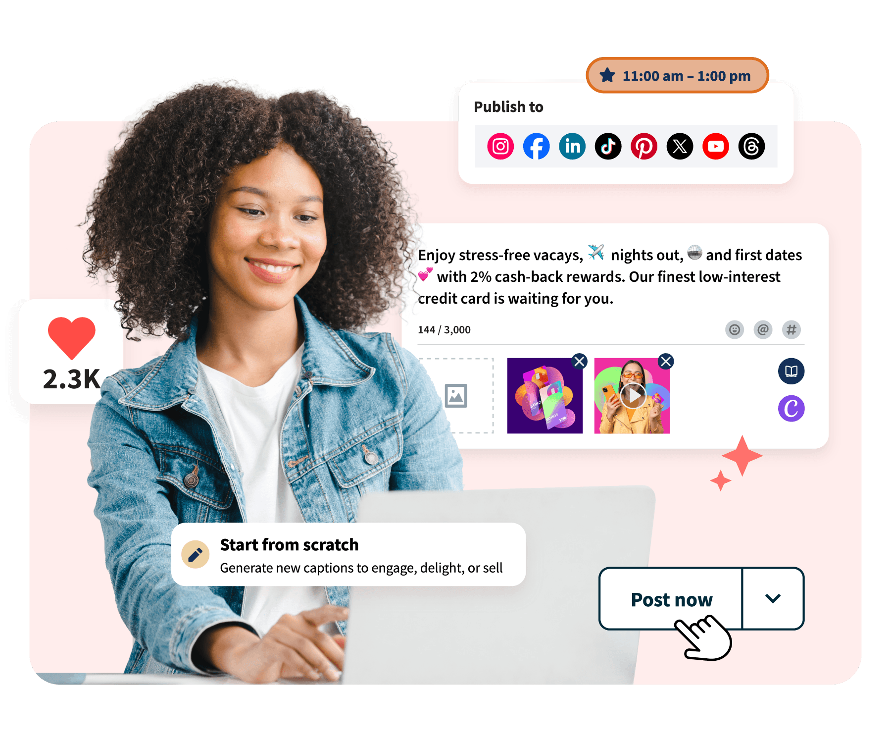 Let AI handle your captions, hashtags, and brainstorms. Plus, bring posts to life in seconds with built-in Canva templates.