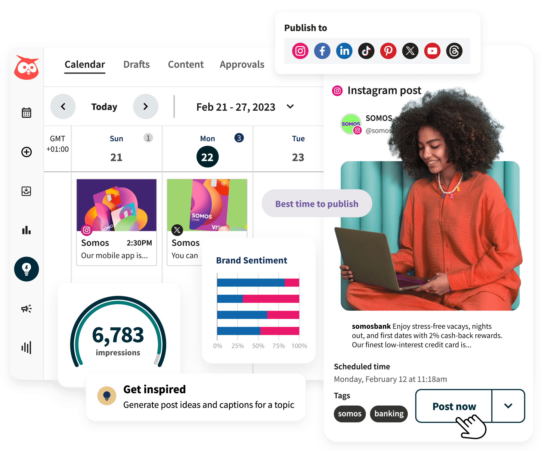 Hootsuite brings scheduling, posting, content creation, and performance tracking to one tab.